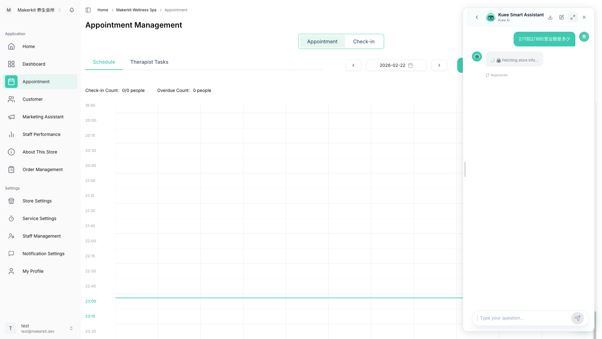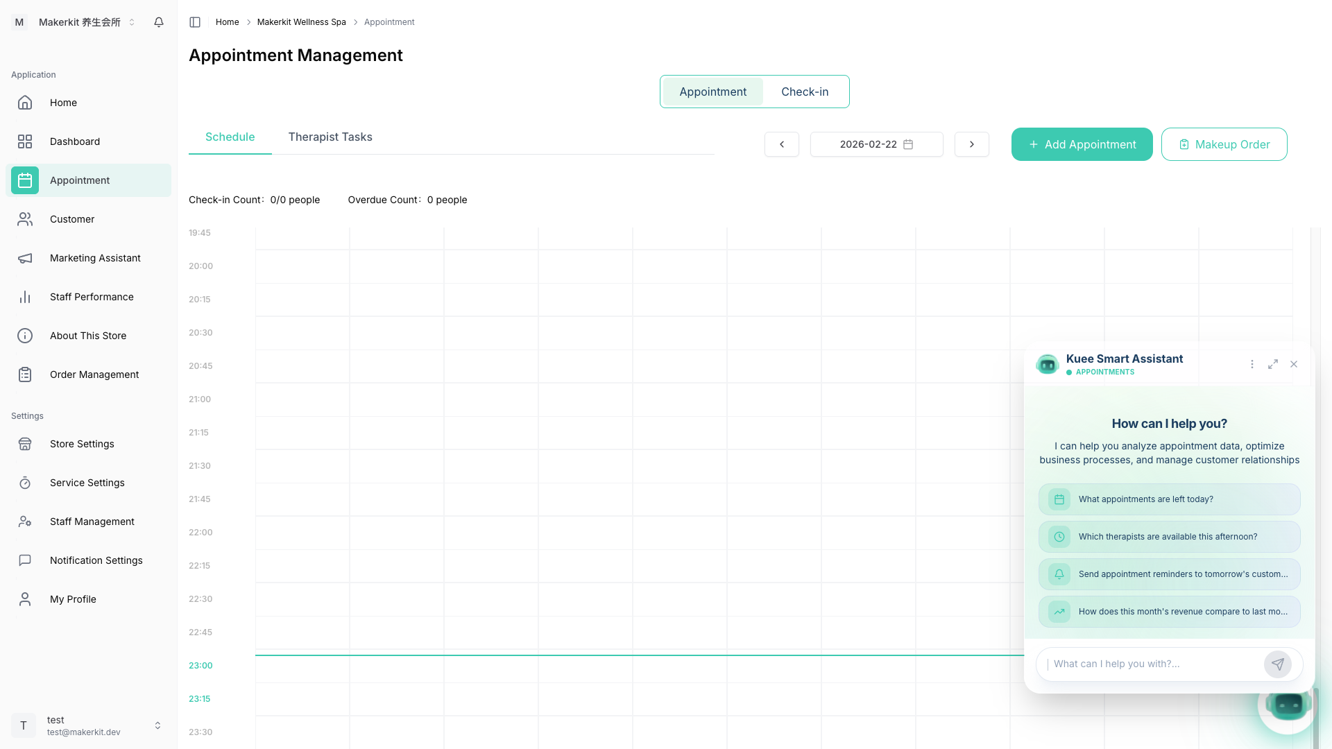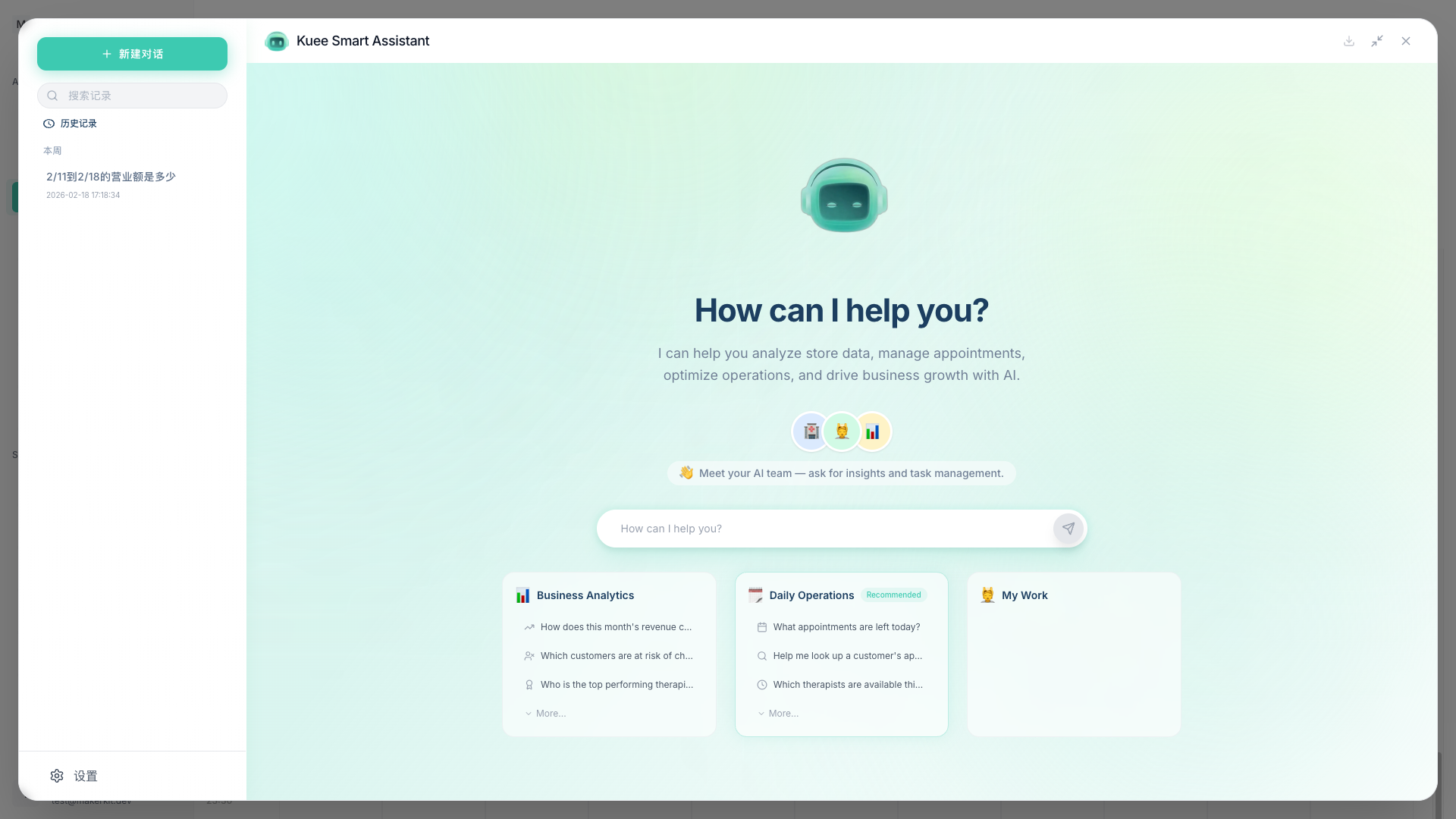 Kuee AI 助手是嵌入门店管理后台的智能对话助手,能够回答业务问题、分析数据、生成可视化图表,以及直接执行操作(如创建预约、发送通知)。