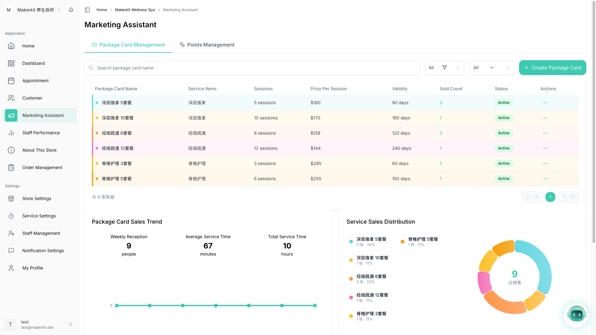 营销助手是专为提升门店营收设计的 AI 分析模块,整合了套餐管理和积分系统的智能洞察。