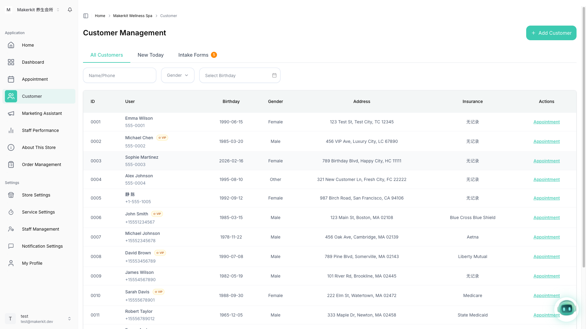 | 전체 고객 | 이름/전화번호/성별/생일 필터가 있는 전체 고객 목록 |