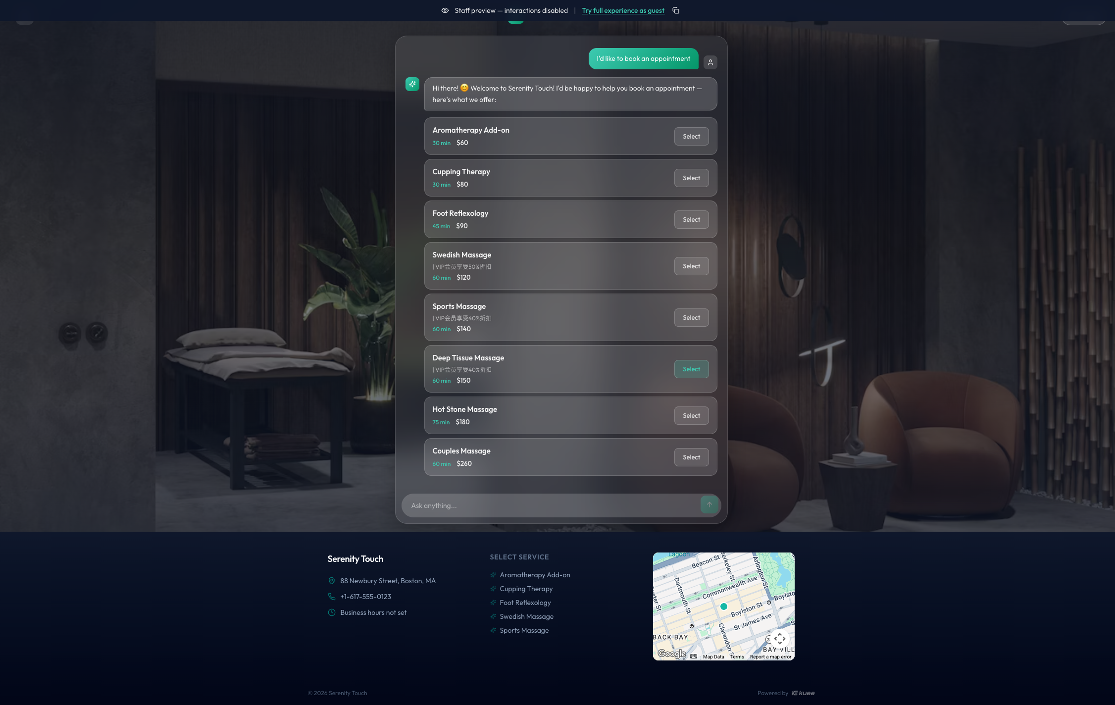 提示: 预约页面还内置了 AI 智能聊天助手。顾客可以通过自然语言对话的方式完成预约,例如直接输入"我想预约明天下午的推拿",AI 助手会引导完成后续流程。
