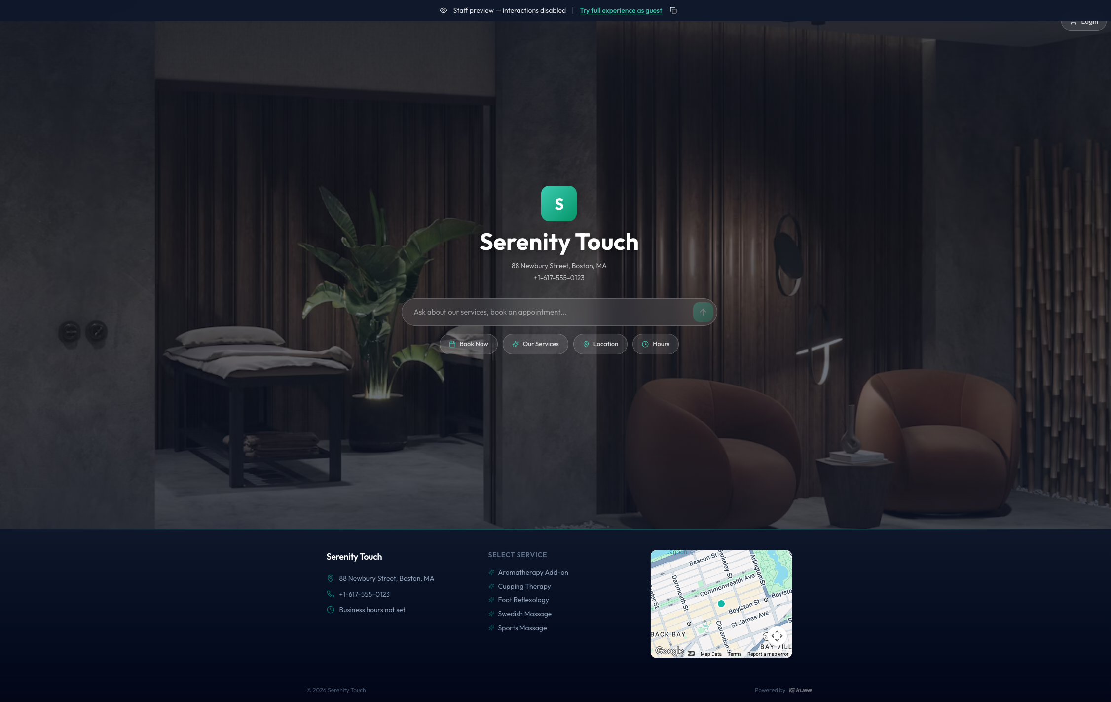 Kuee 为每家门店提供一个专属的在线预约页面,顾客可以直接在该页面浏览服务项目、选择理疗师和时间段,完成自助预约。