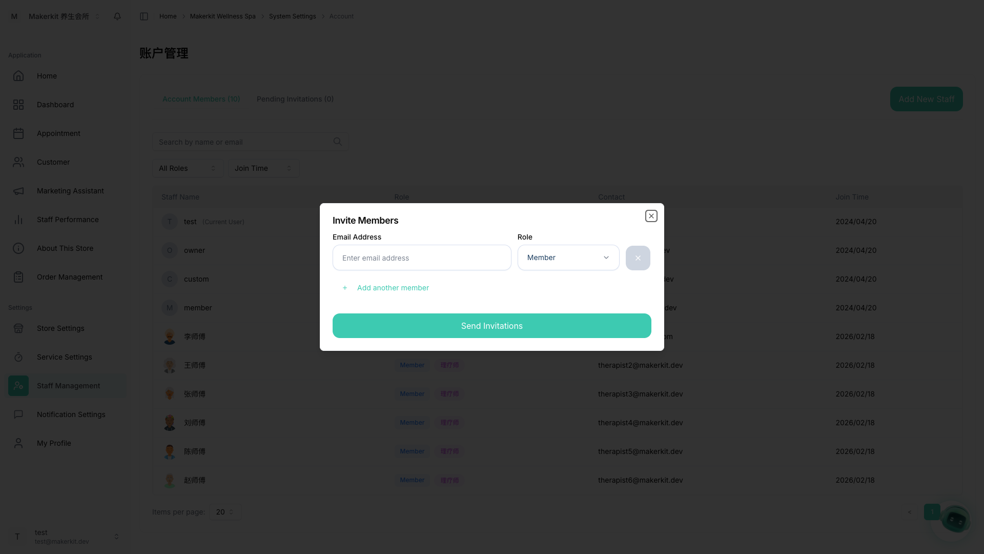 오른쪽 상단의 새 직원 추가를 클릭하여 초대 대화 상자를 엽니다: