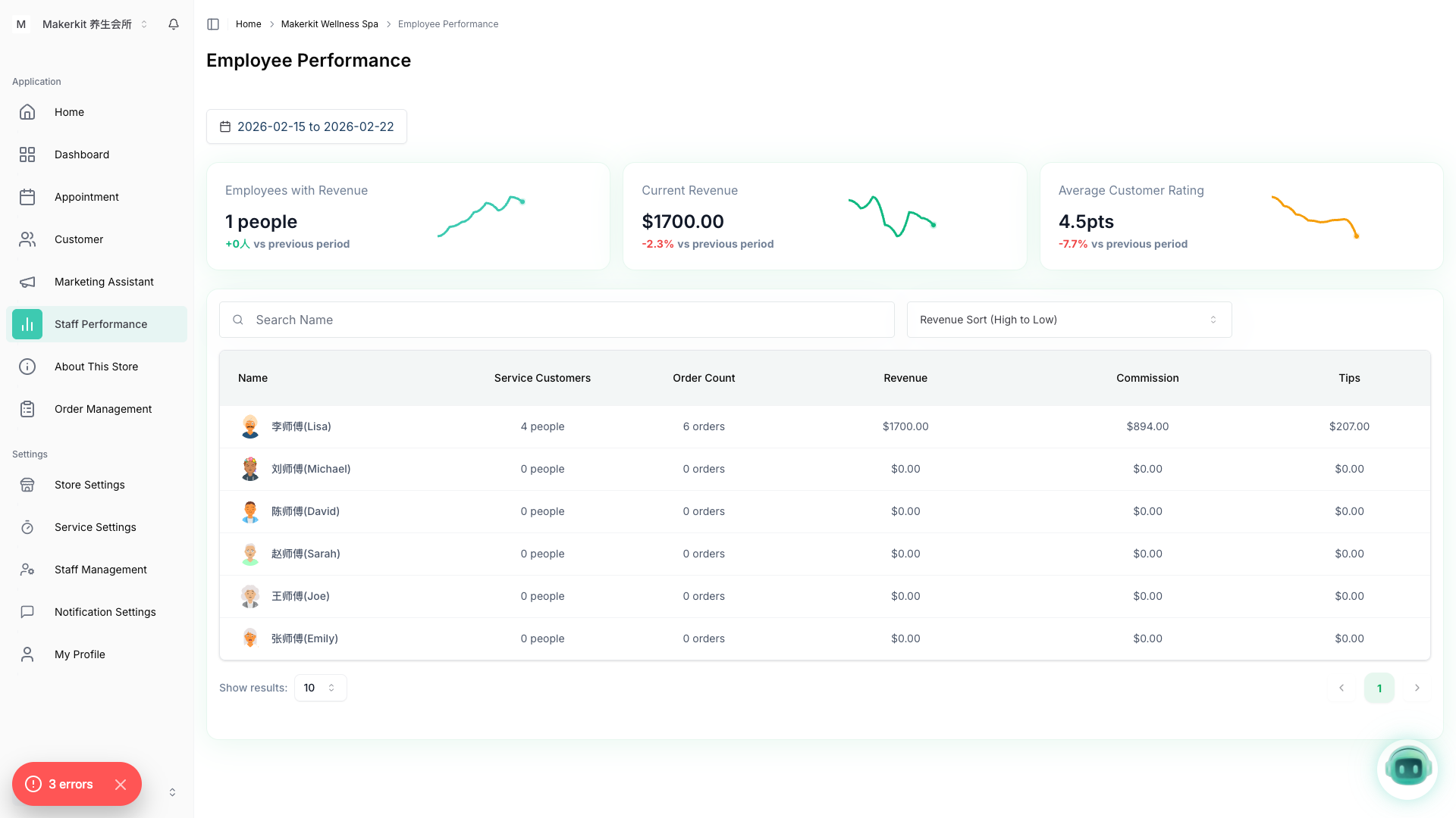 왼쪽 사이드바에서 직원 성과를 클릭하여 서비스 및 매출 분석을 확인합니다: